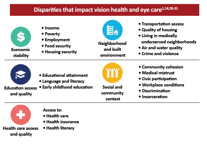 Social determinants of health are grouped under five categories: Economic Stability, Education Access and Quality, Healthcare Access and Quality, Neighborhood and Built Environment, and Social and Community Context. Within eyecare, several prominent social determinants of health can contribute to the prevalence of eye disease including:3