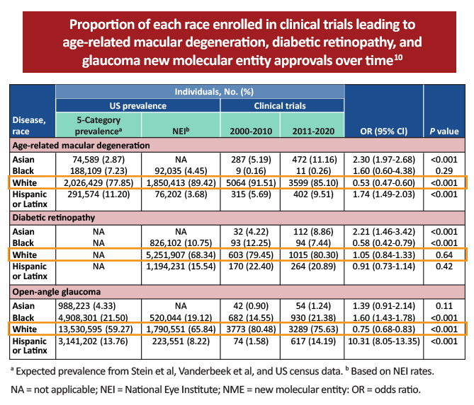 - Black, Hispanic or Latino, and other non-White participants were underrepresented in clinical trials leading to FDA new molecular entity drug approvals in AMD, DR, and open-angle glaucoma in a cohort study examining 20 years of data. While there was some improvement in representation between 2000 and 2020, the researchers concluded that more diversity is needed. If the current trends remain, there could be a continued overrepresentation of White participants by 2050, particularly in AMD trials.10