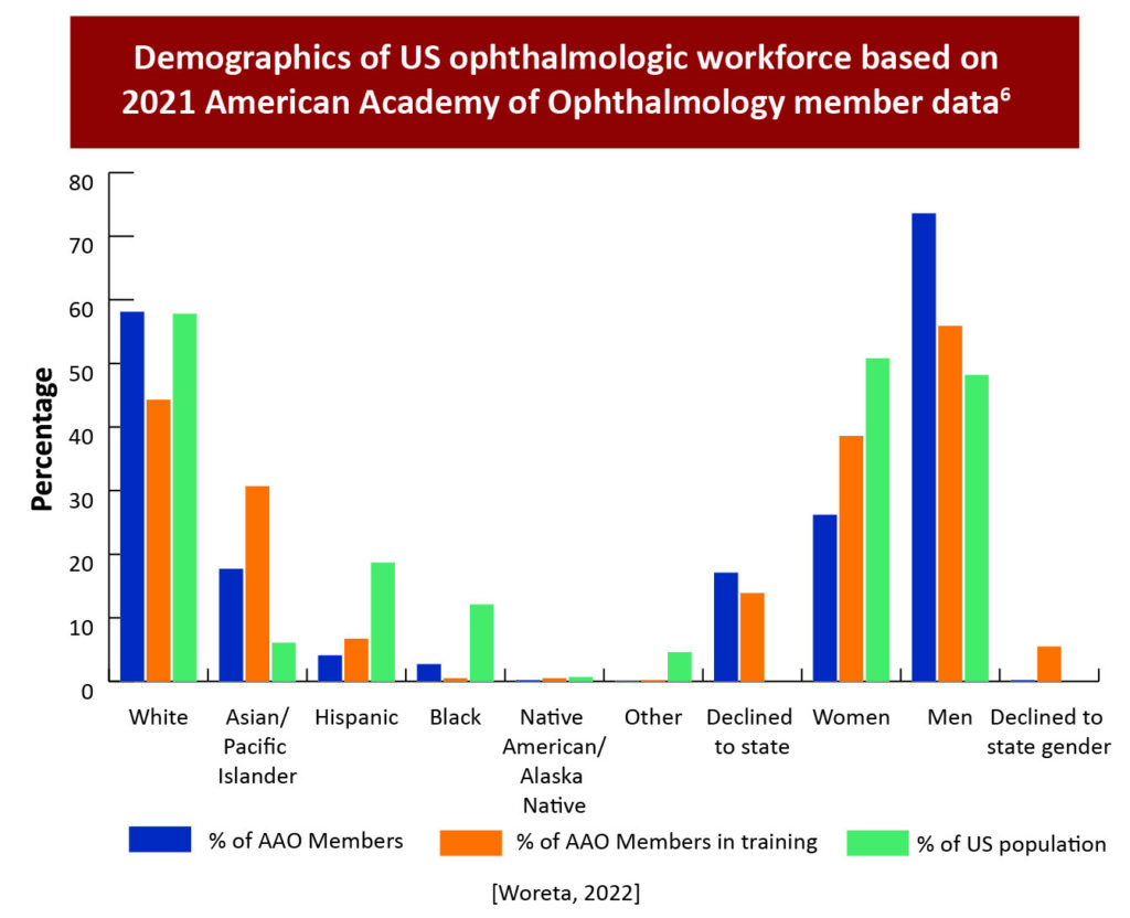 - Woreta FA, Gordon LK, Knight OJ, et al. Enhancing diversity in the ophthalmology workforce. Ophthalmology. 2022;129:e127-e136. https://www.sciencedirect.com/science/article/pii/S0161642022004948